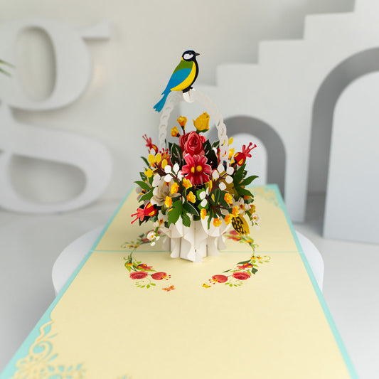 Basket of Flowers and Bird Pop-up Card